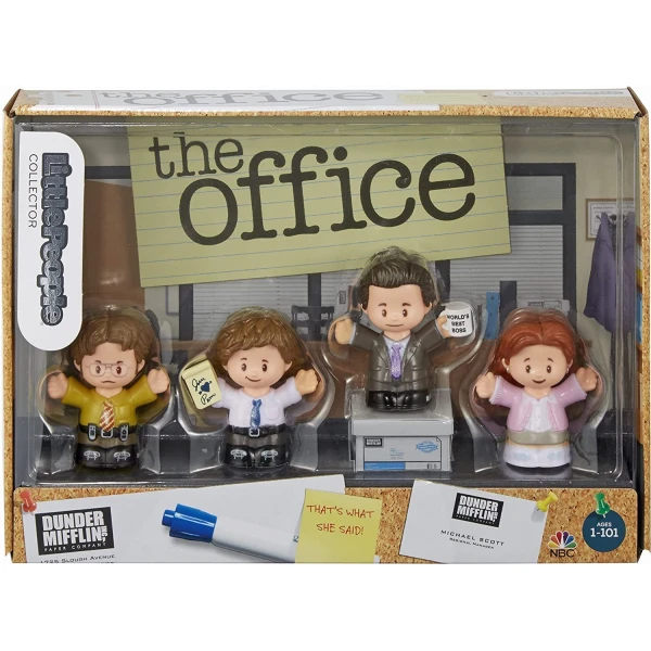 Bring the shenanigans of the Dunder Mifflin paper company to your home with this Little People Collector The Office figure set by Fisher-Price! This set features four figures styled to look just like characters from the hit American TV series The Office, including Michael Scott, Dwight Schrute, Pam Beesly and Jim Halpert. This must-have figure set is a great gift for The Office fans of all ages!
